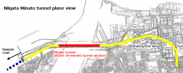 The Niigata west port is one of the largest sea ports opened to the Sea of Japan located at the river mouth of the Shinano River, however, there was no road connecting right and left bank that may enable smoother harbor distribution and transportation. This issue was considered to be the obstacle for years to Niigata to step forward to further development and for dairy life of regional habitants. In such circumstance, the action to build up connection route was looked forward strongly from the year 1919, and now longtime dream of the habitants comes true at last. The "Niigata Minato tunnel" crossing the Shinano River is completed. The whole route was opened in July, 2005 in the same time with the seaside road opening that improved greatly the traffic convenience between east and west bank areas of the Shinano River. Also access to Niigata west coast area was improved where sandy beach restoration work is now advanced.