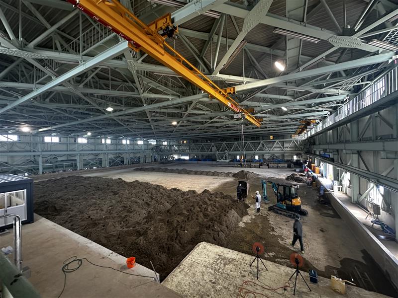 水理実験場内に設置されているクレーンを使い砂を水槽内に搬入します。